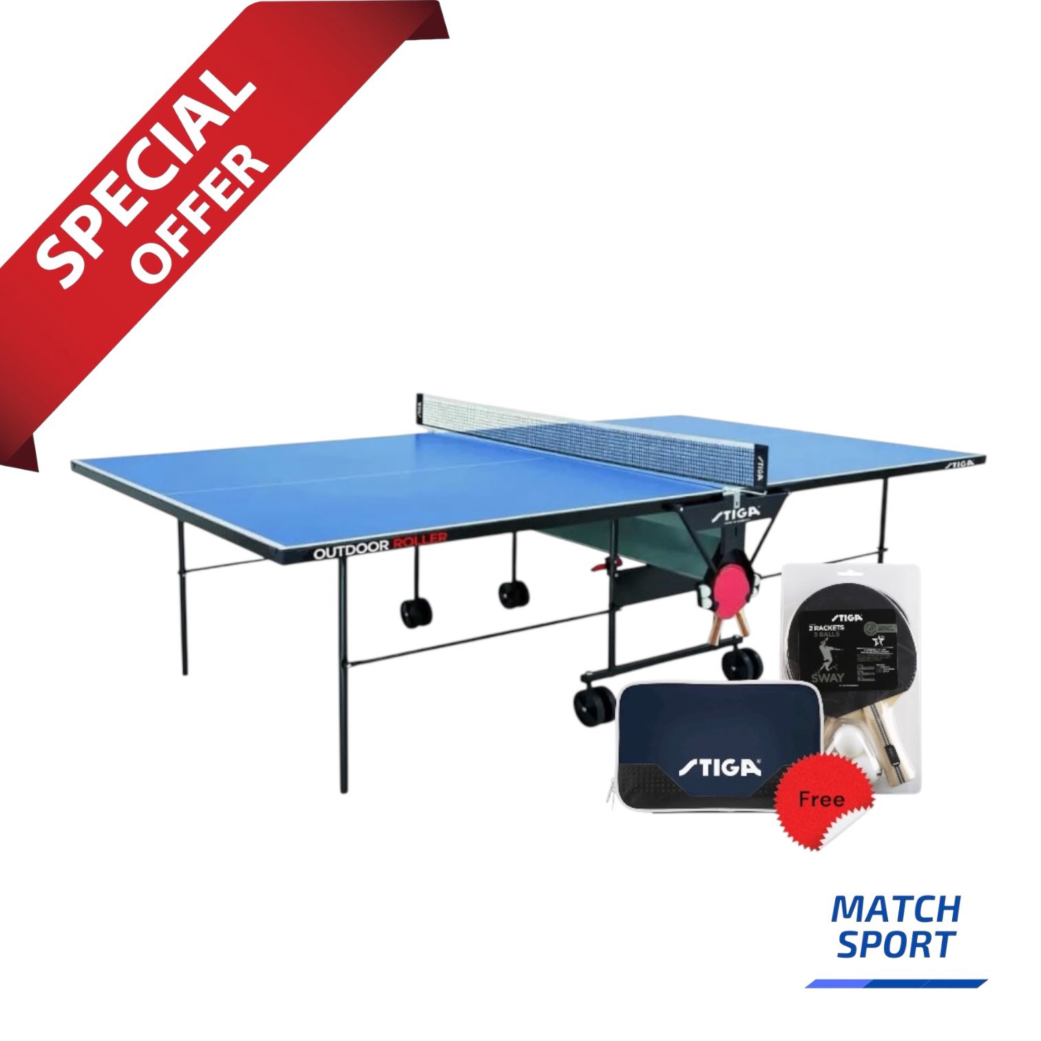 Purchase the Stiga Outdoor Roller Table Tennis Table with Net and get FREE Stiga Sway Table Tennis Racket Set and Stiga Double Wallet for Table Tennis Bat!